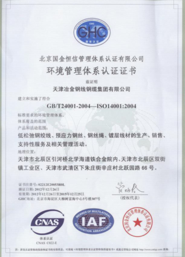 • 南通鋼絲繩環境管理體系認證證書